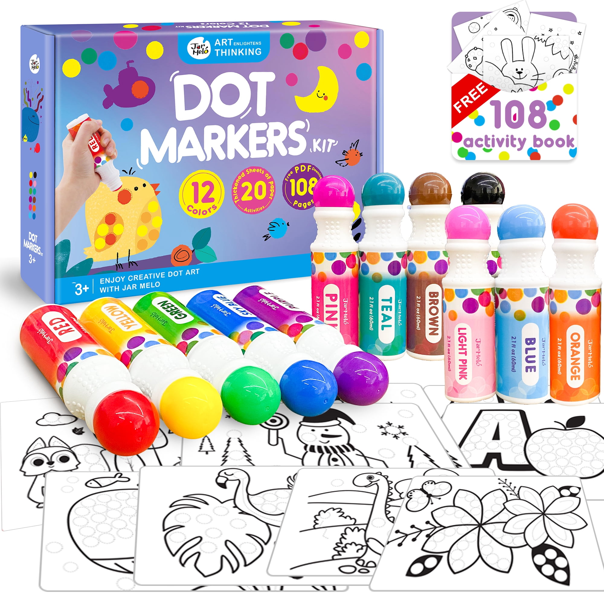 Jar Melo 12 Colors Washable Dot Markers Kit For 3 8 Age Kids Non Toxic Dot Paint Markers With 108 Free Pdf Activity Book Physical Sheets 2 1 Fl Oz Walmart Com